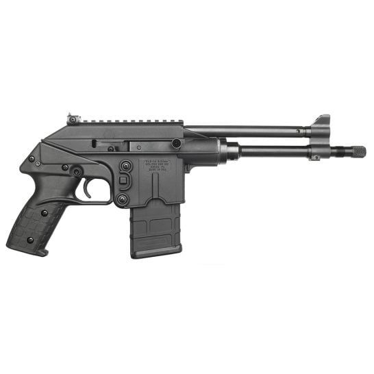 The Kel-tec 223 Rem/5.56 NATO 10 Round Semi Auto Gas Operated Pistol is a gas operated, semi-automatic pistol chambered in 5.56mm NATO caliber. It was designed and intended as a long range target and hunting pistol. It has a conventional gas piston operation and utilizes the proven M-16 breech locking system. The rear sight is adjustable for windage. The front sight is of M-16 type. An integrated MIL-STD 1913 picatinny rail will accept a multitude of standard accessories. The muzzle end of the barrel is threaded .5-28 TPI to accept standard attachments such as a muzzle brake. Except for the barrel, bolt, sights and mechanism, the PLR-16 pistol is made entirely of high-impact glass fiber reinforced polymer.